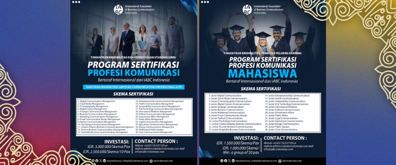 Bagi yang ingin mendapatkan sertifikasi ber-BNSP, dual certification dengan IABC Indonesia, kami menawarkan program yang menjawab kebutuhan akan pengakuan ganda dalam dunia kerja, hasil kolaborasi antara IABC Indonesia dan Lembaga Sertifikasi Profesi Public Relations Indonesia (LSP-PRI). Program ini menggabungkan standar global IABC dengan kompetensi nasional yang diakui oleh Badan Nasional Sertifikasi Profesi (BNSP). Dengan sertifikasi ini, para profesional tidak hanya memperoleh pengakuan internasional, tetapi juga legitimasi formal dalam kerangka kerja nasional Indonesia. Link pendaftaran berikut.