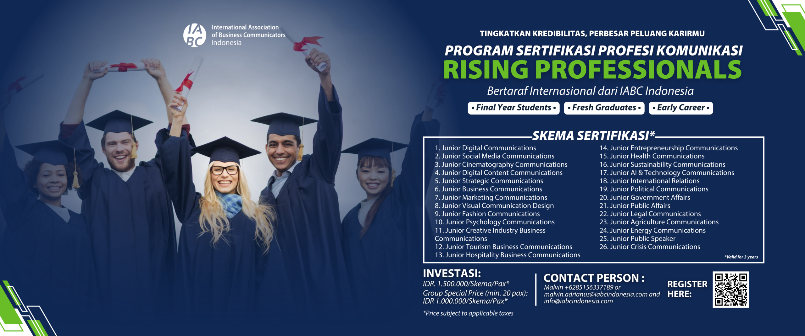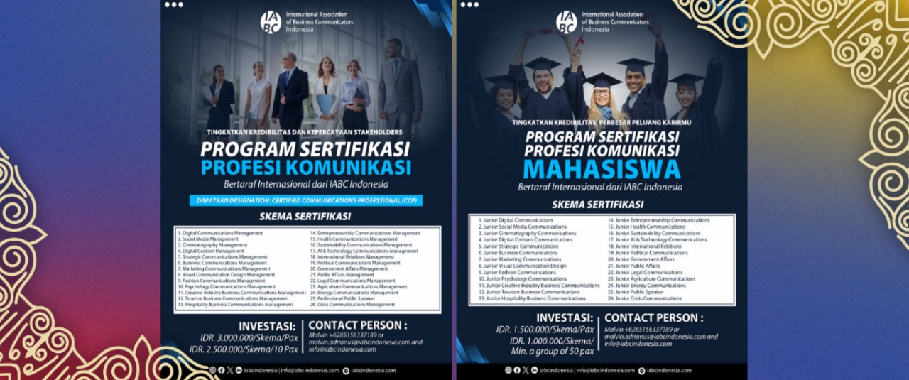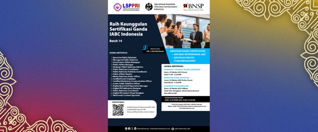 For those seeking BNSP-accredited certification with dual recognition from IABC Indonesia, we offer a program that meets the growing demand for dual credentials in the professional field. This initiative is a collaboration between IABC Indonesia and the Public Relations Indonesia Professional Certification Institute (LSP-PRI). The program combines IABC’s global standards with national competencies recognized by the National Professional Certification Agency (BNSP). Through this certification, professionals not only gain international recognition but also formal legitimacy within Indonesia’s national qualification framework. Registration can be completed through the following link.