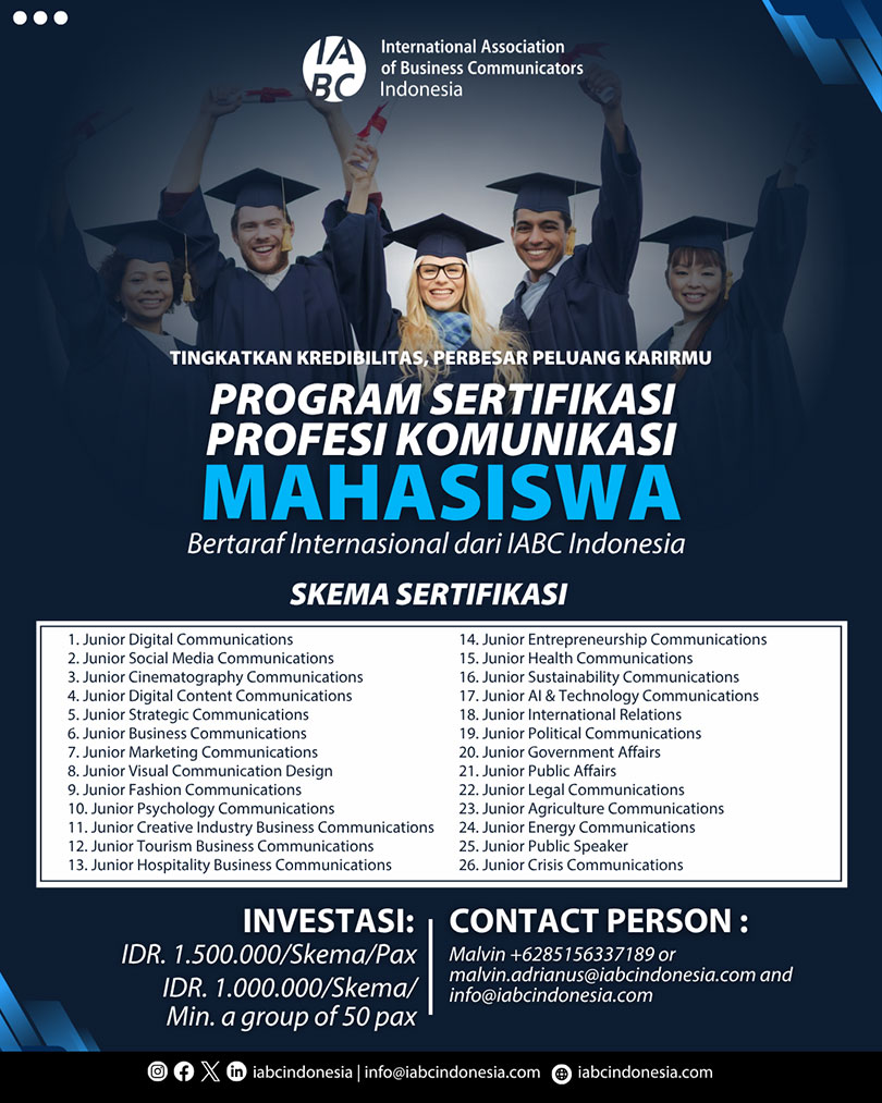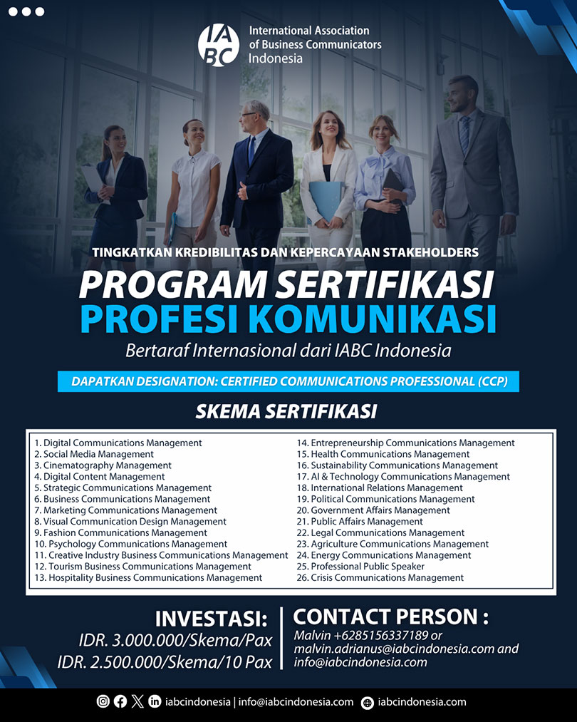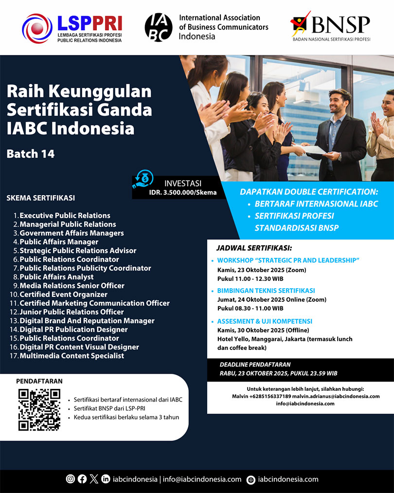 The International Association of Business Communicators (IABC) Indonesia, with the support of the National Professional Certification Agency (BNSP) and the Public Relations Professional Certification Institute (LSP-PRI), invites communication and public relations professionals to obtain a prestigious double certification—an internationally recognized certification from IABC and a professional certification standardized by BNSP.